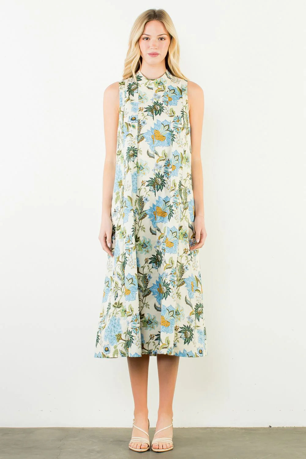 Elevate your wardrobe with this refined cream dress, featuring an enchanting blue and green floral pattern that captures effortless elegance. The high neckline and graceful A-line silhouette create a flattering, timeless look, while the delicate tie detail at the back adds a touch of sophistication. Cut to a charming tea length and lined to the knee for comfort and movement, this piece is crafted from breathable 100% cotton—perfect for warm weather gatherings or casual refinement. A versatile staple that transitions seamlessly from day to evening.