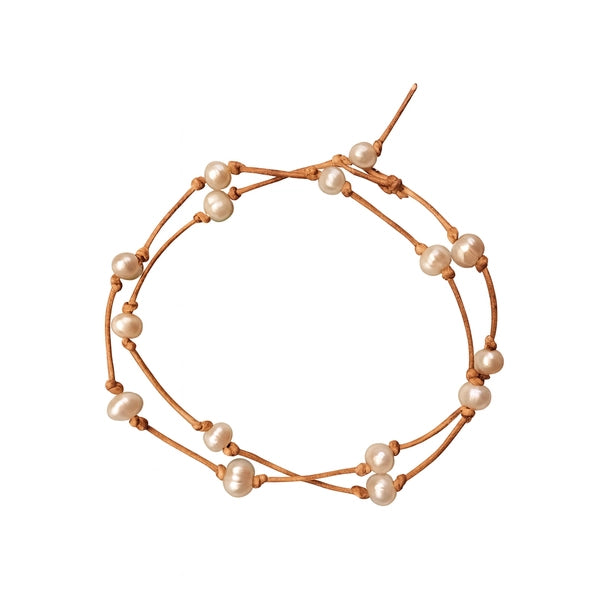 Convertible freshwater pearl and leather cord jewelry wearable as a necklace, bracelet, or anklet