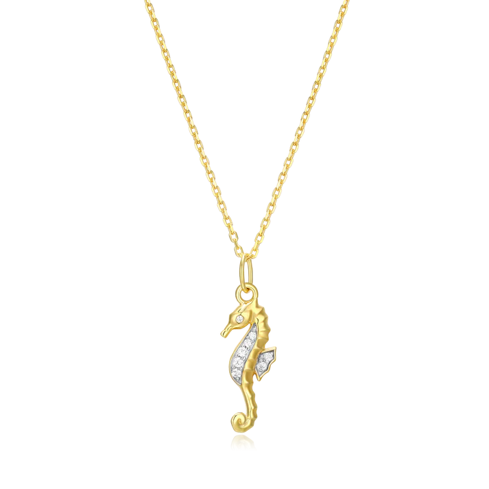 A tiny guardian of the sea, rendered in diamonds and precious metal. This lovely seahorse pendant whispers tales of hidden coral kingdoms and the gentle rhythm of tides.