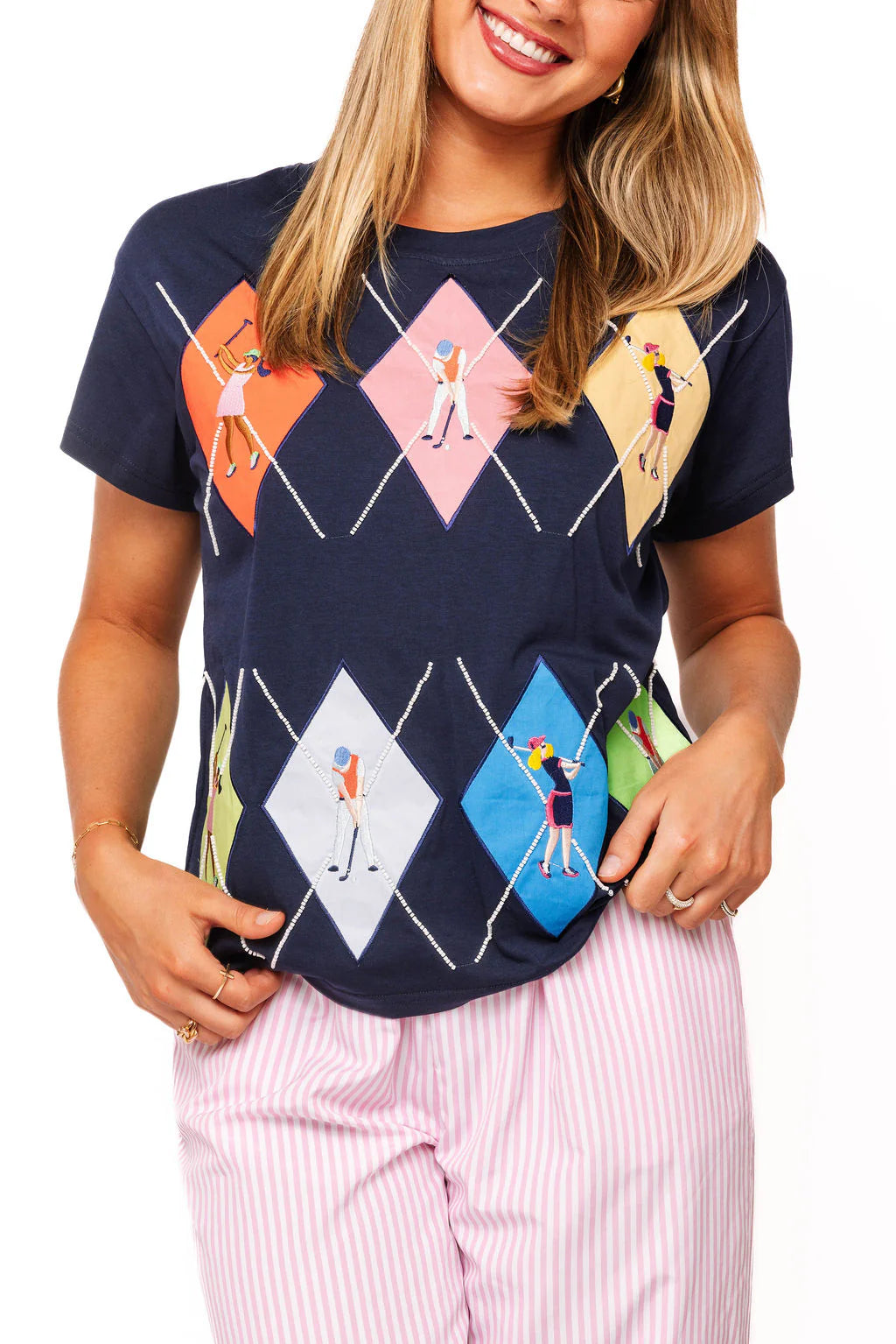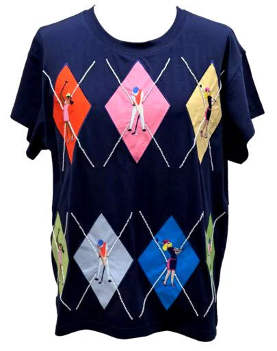The Queen Of Sparkles Navy Multi Argyle Golfer Tee has a loose, comfortable fit with a classic crewneck and short sleeves. Colorful argyle accents give this top a playful, sporty feel, perfect for layering or wearing on its own.