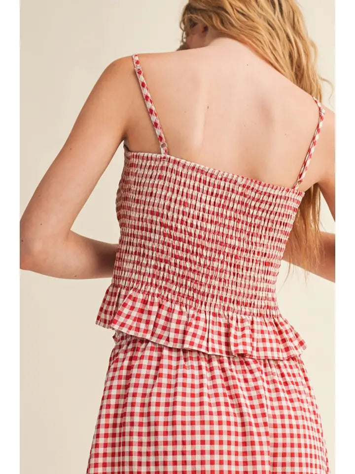 Embrace effortless elegance with this charming two-piece set featuring a whimsical gingham pattern. The smocking top showcases adjustable spaghetti straps for a customized fit, while the coordinating long skirt offers comfort with its elastic waist and drawstring detail. Crafted from a breathable polyester-spandex blend, this set moves with you throughout your day. Button-front styling adds a polished touch perfect for casual outings or relaxed gatherings. Hand wash to maintain the fabric's quality and vibrant pattern.