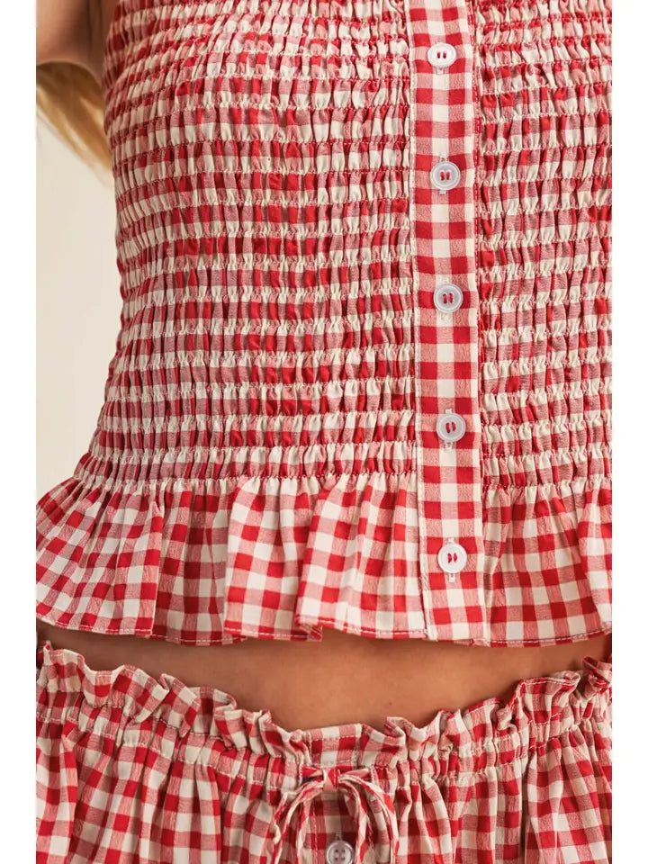 Gingham Pattern Button Front Smocking Top and Long Skirt Set