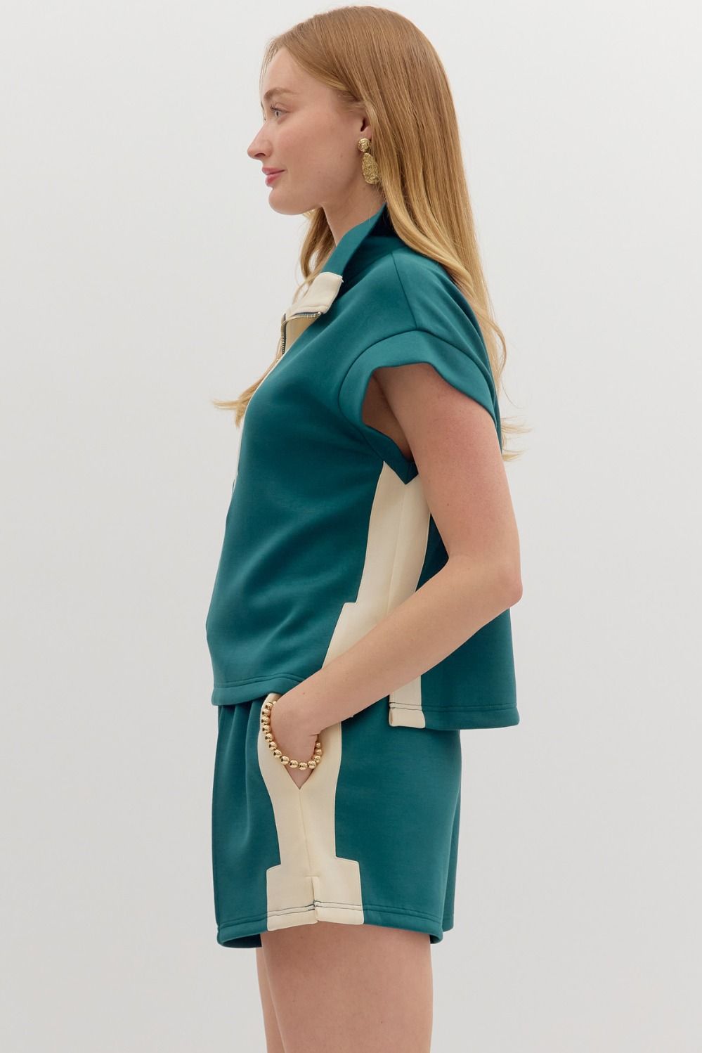 Solid contrast accent zip-front pullover top featuring contrast side slit band. Unlined. Knit. Non-sheer. Lightweight.