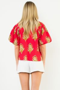 Elevate your casual wardrobe with this striking magenta top, featuring delicate floral detailing and charming puff sleeves. The standout blue and orange vertical stripe running down the front adds sophisticated visual interest while maintaining an effortlessly refined aesthetic. Crafted from 100% cotton, this piece offers breathable comfort without compromising on style. Versatile enough to transition seamlessly from day to night, it pairs beautifully with denim for a relaxed weekend look or tailored shorts for a polished ensemble.