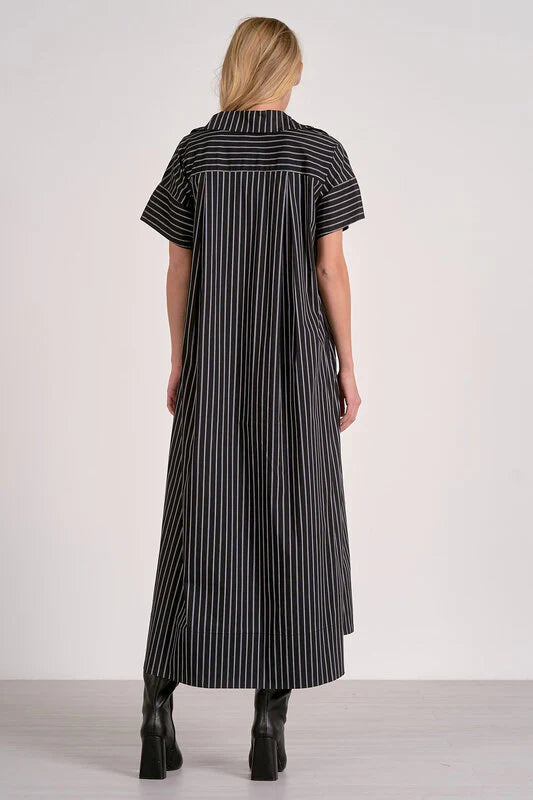 This Elan Stripe Maxi Shirt Dress features a charming striped pattern and an optional belt tie to accentuate your waist. Perfect for dressing up or down, it effortlessly blends comfort with style for any occasion. Its maxi length and relaxed fit make it a cute and versatile addition to your wardrobe.